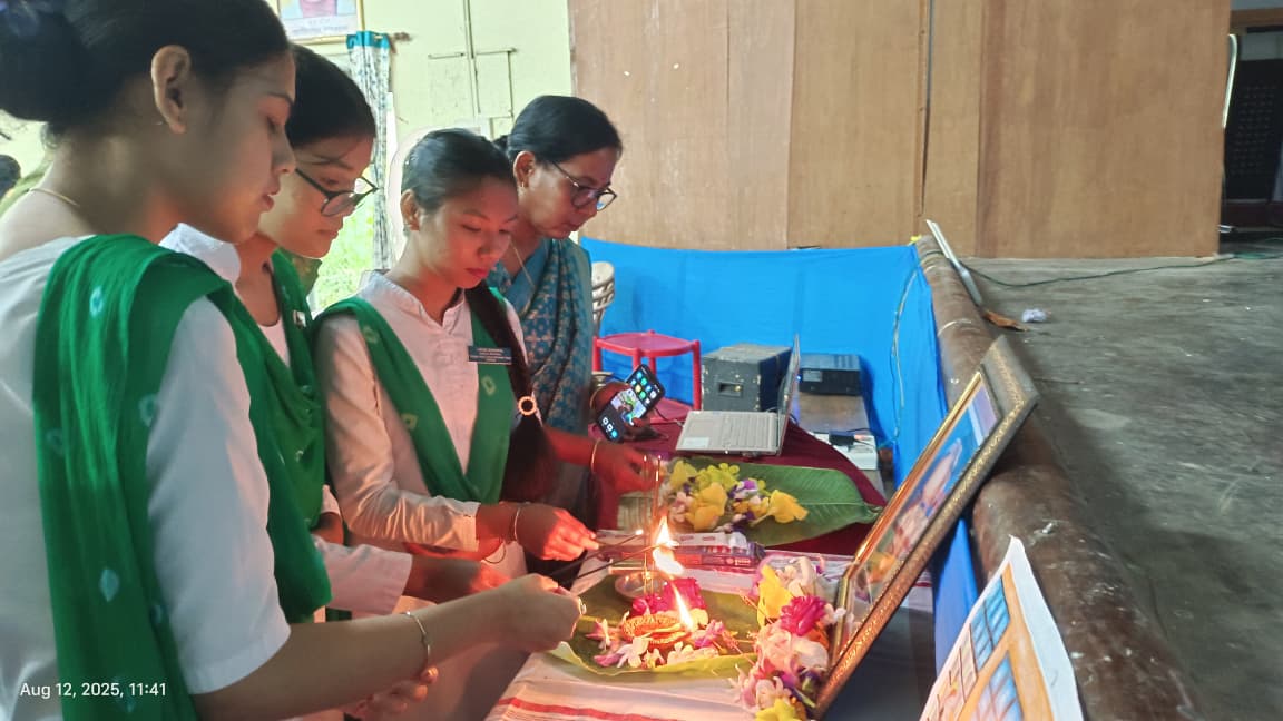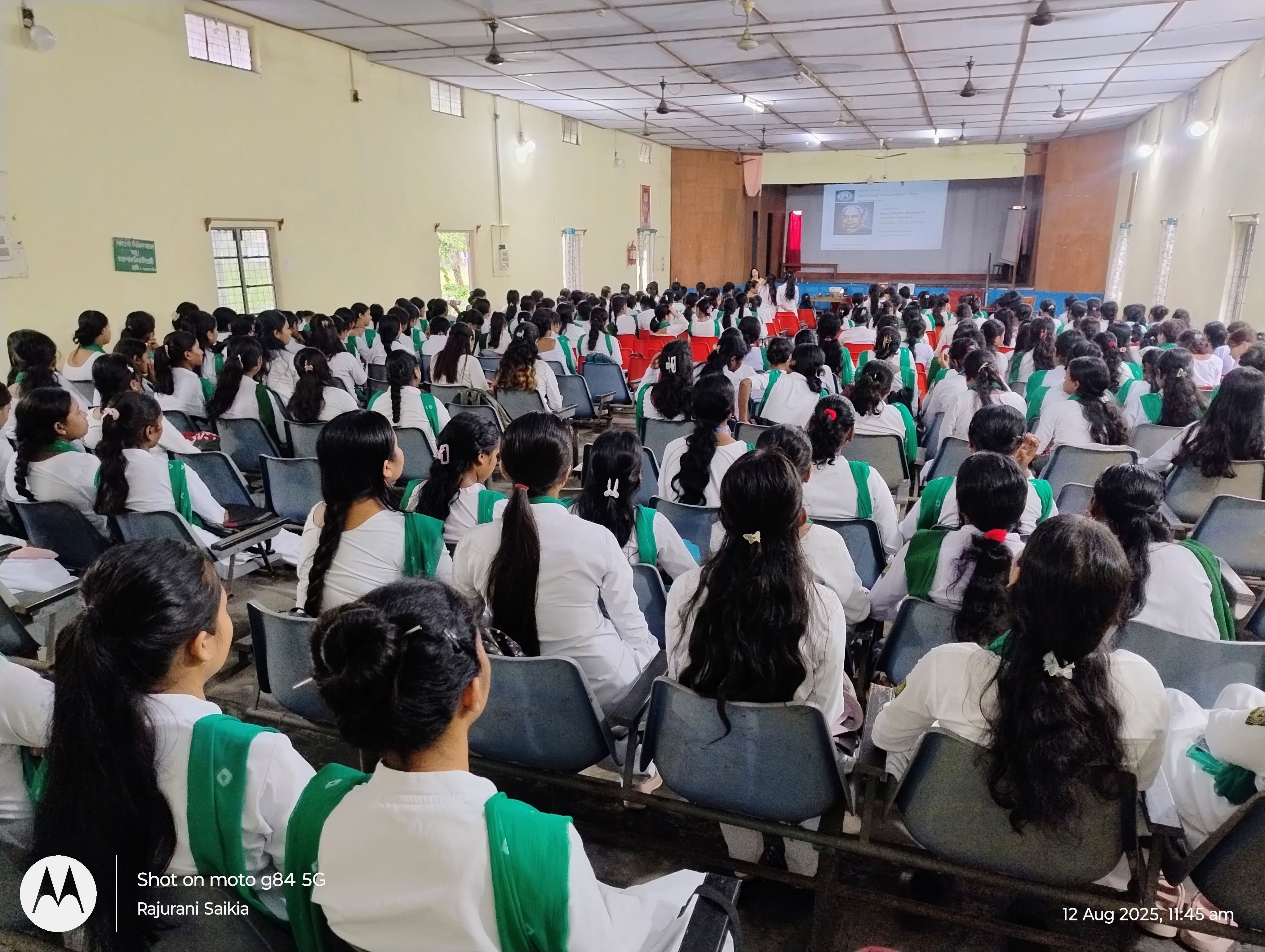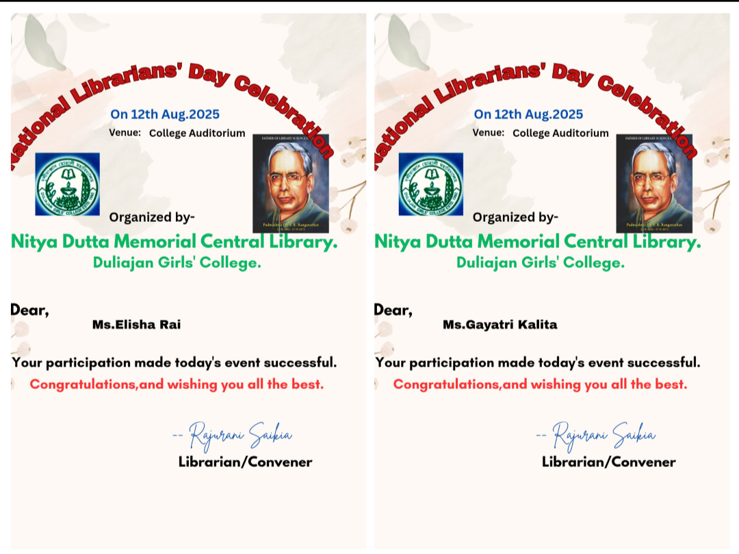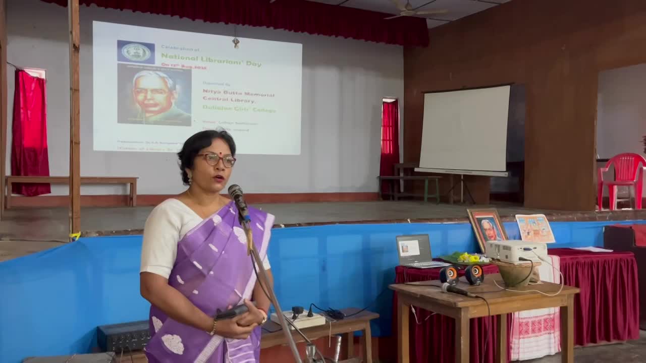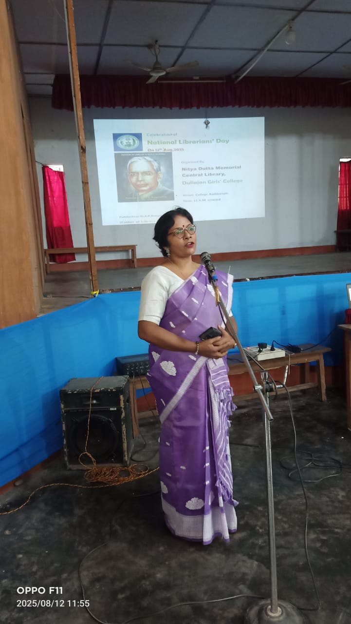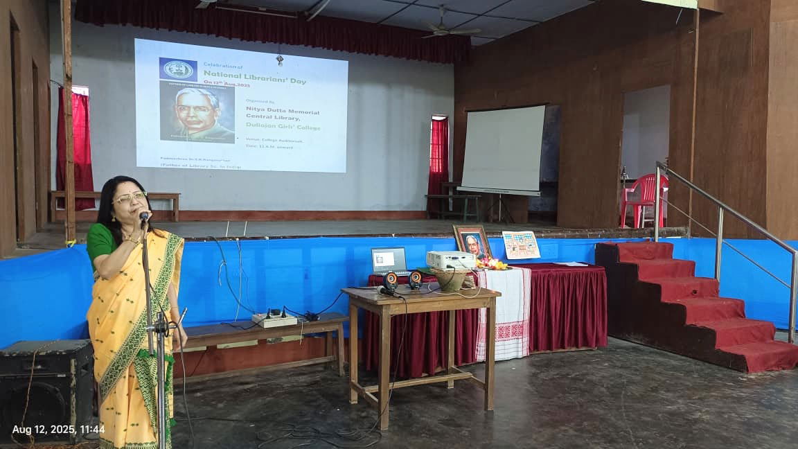12 August,2025, Tuesday National Librarians' Day was celebrated in Duliajan Girls' College.It was organized by Nitya Dutta Memorial Central Library of the college.The event was held at the college auditorium. At first,as per agenda objective of the day was explained by Librarian Rajurani Saikia.The next program was to pay tribute to the renowned sage by lighting a lantern in front of the portrait of Padmashri Dr. S.R Ranganathan.After that honourable Principal Dr. Jashashya Bora gave a welcome speech.In her speech she spoke about the role of a library in education and the contribution of librarians.Librarian Rajurani Saikia briefed the students on the life of Dr. Ranganathan and his works. She also screened a short documentary on the life of Dr. Ranganathan.The program was attended by several students who read articles written about their favorite books. The students also expressed their views on their experiences of using the library. The participating students were awarded books and certificates by the librarian of the college. The event was successful by the attendance of more than 300 students, teachers and staff.The program concluded with the National Anthem 'O mor aponar desh' after the librarian of the college as well as the convener of the programme Rajurani Saikia offered a vote of thanks to all for making the event successful.