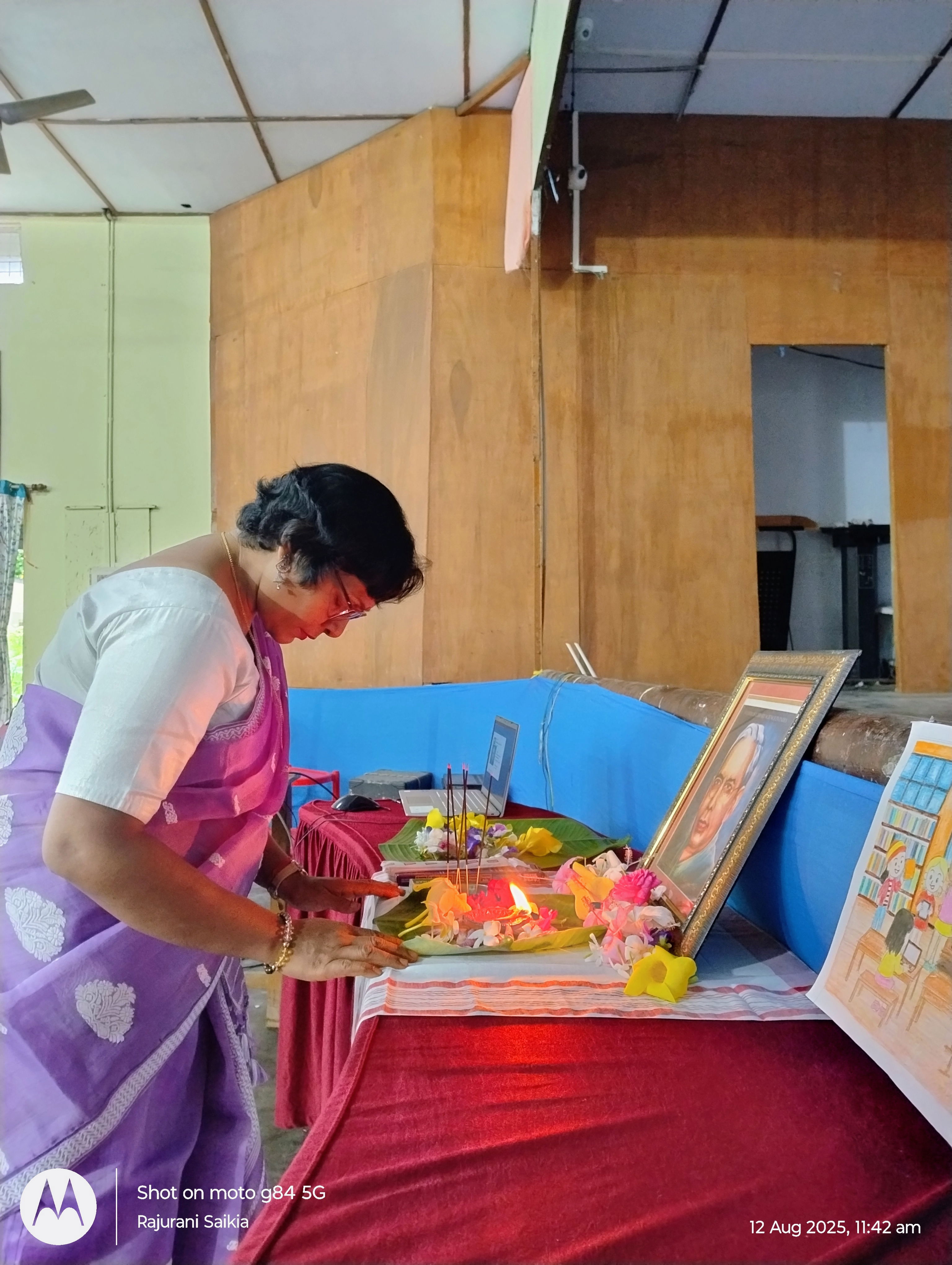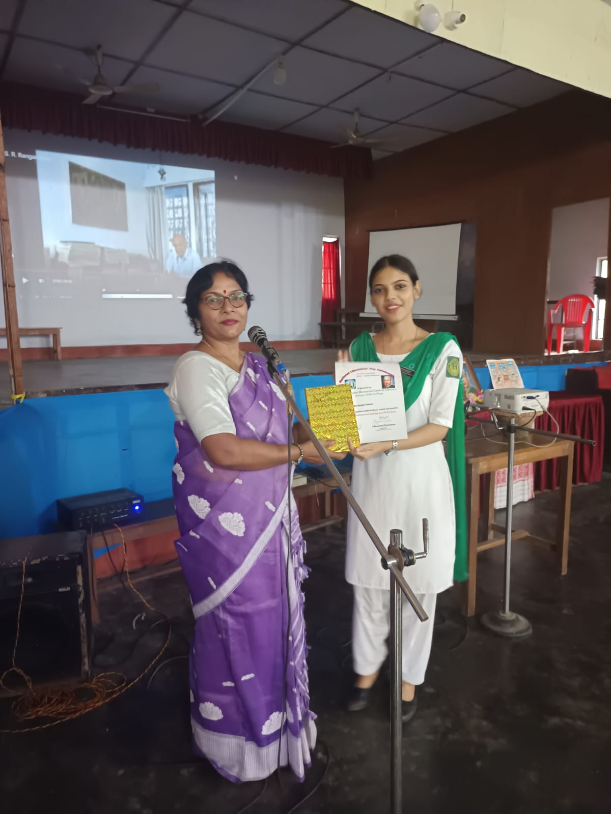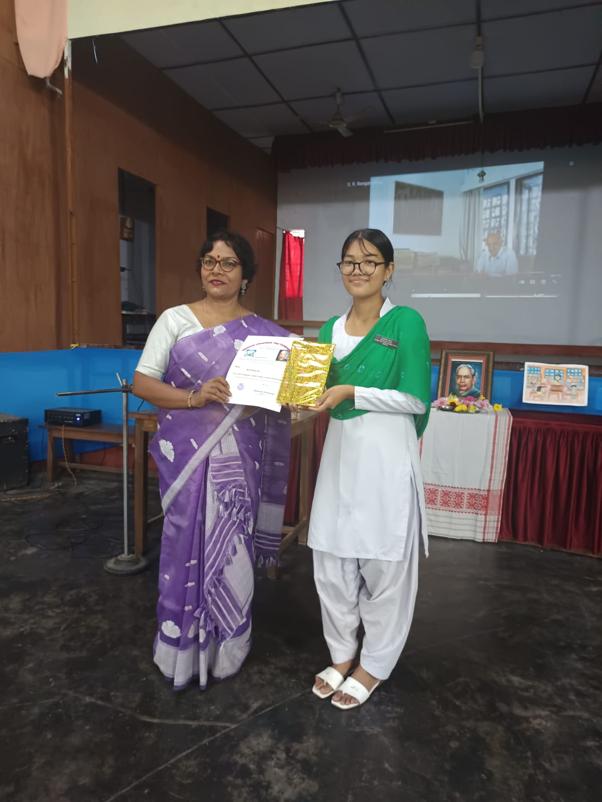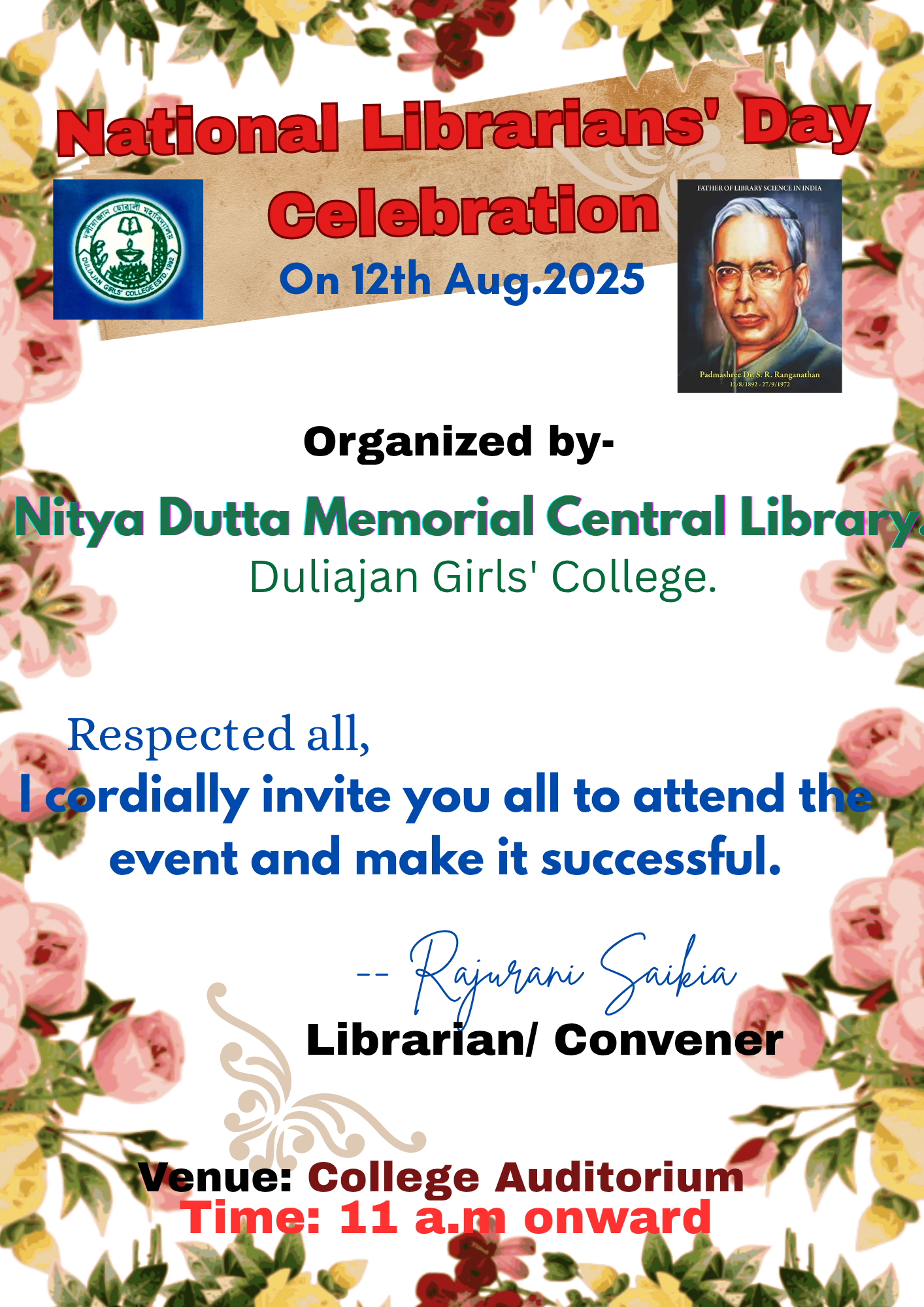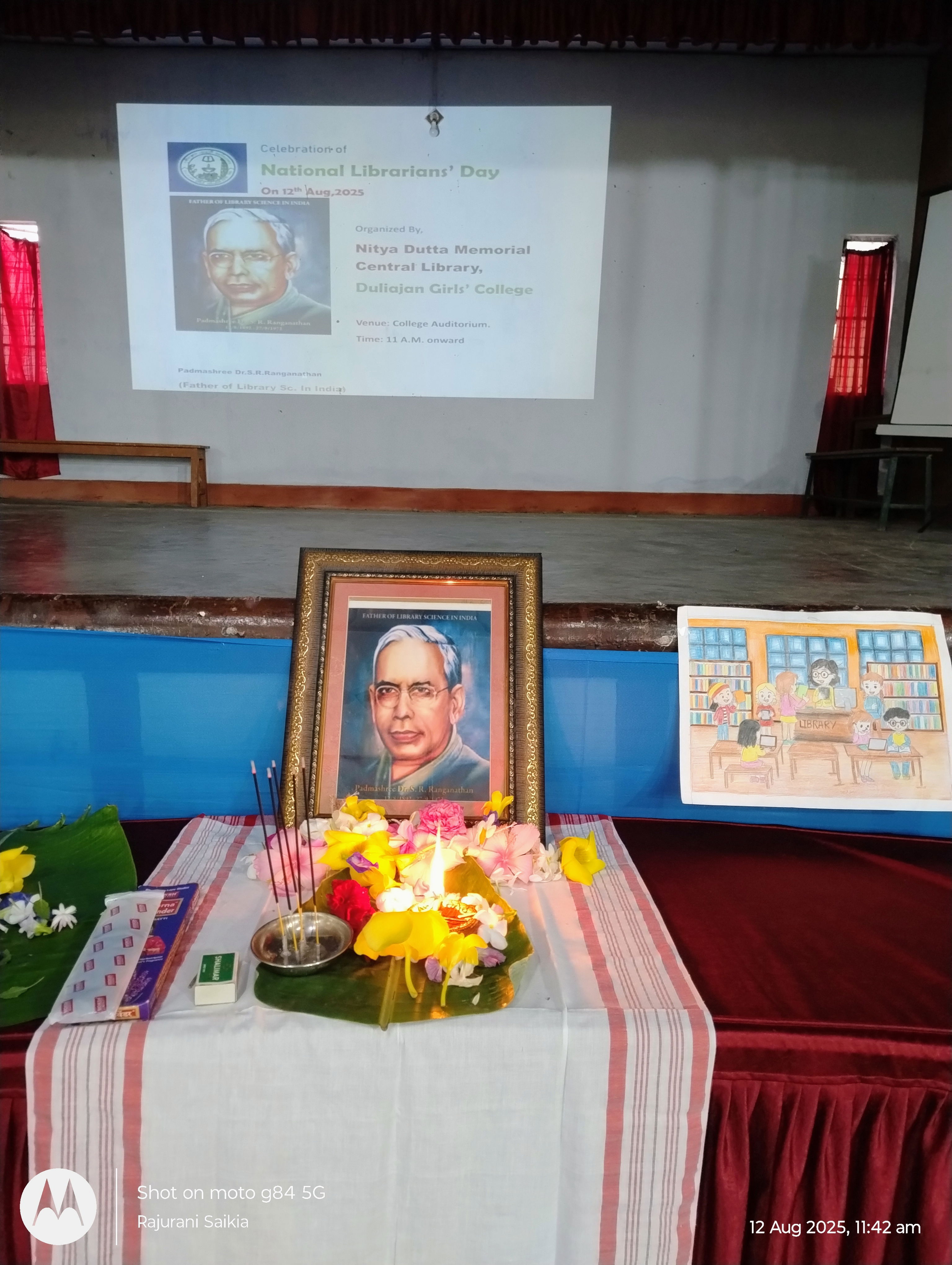 12 August,2025, Tuesday National Librarians' Day was celebrated in Duliajan Girls' College.It was organized by Nitya Dutta Memorial Central Library of the college.The event was held at the college auditorium. At first,as per agenda objective of the day was explained by Librarian Rajurani Saikia.The next program was to pay tribute to the renowned sage by lighting a lantern in front of the portrait of Padmashri Dr. S.R Ranganathan.After that honourable Principal Dr. Jashashya Bora gave a welcome speech.In her speech she spoke about the role of a library in education and the contribution of librarians.Librarian Rajurani Saikia briefed the students on the life of Dr. Ranganathan and his works. She also screened a short documentary on the life of Dr. Ranganathan.The program was attended by several students who read articles written about their favorite books. The students also expressed their views on their experiences of using the library. The participating students were awarded books and certificates by the librarian of the college. The event was successful by the attendance of more than 300 students, teachers and staff.The program concluded with the National Anthem 'O mor aponar desh' after the librarian of the college as well as the convener of the programme Rajurani Saikia offered a vote of thanks to all for making the event successful.